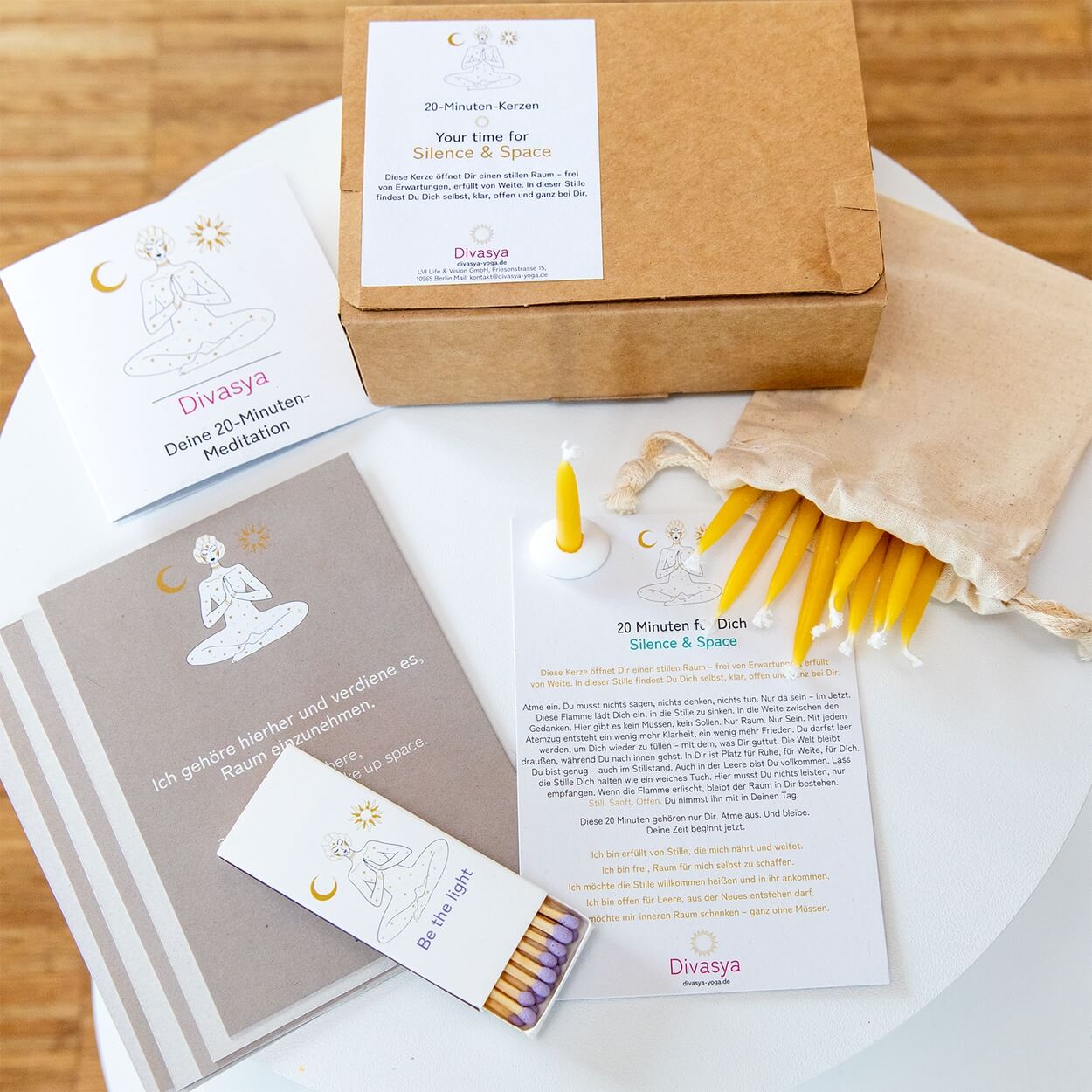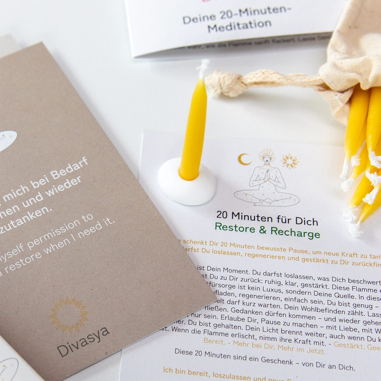 Gönne Dir bewusste Auszeiten im Alltag – ganz ohne Handy, Uhr oder Wecker. Das „20 Minuten für Dich!“ Set ist Dein liebevoll gestaltetes Ritual für innere Ruhe, Fokus und Selbstfürsorge. Jede Bienenwachskerze brennt 20 Minuten – Deine Einladung, den Moment zu genießen, loszulassen und bei Dir anzukommen.