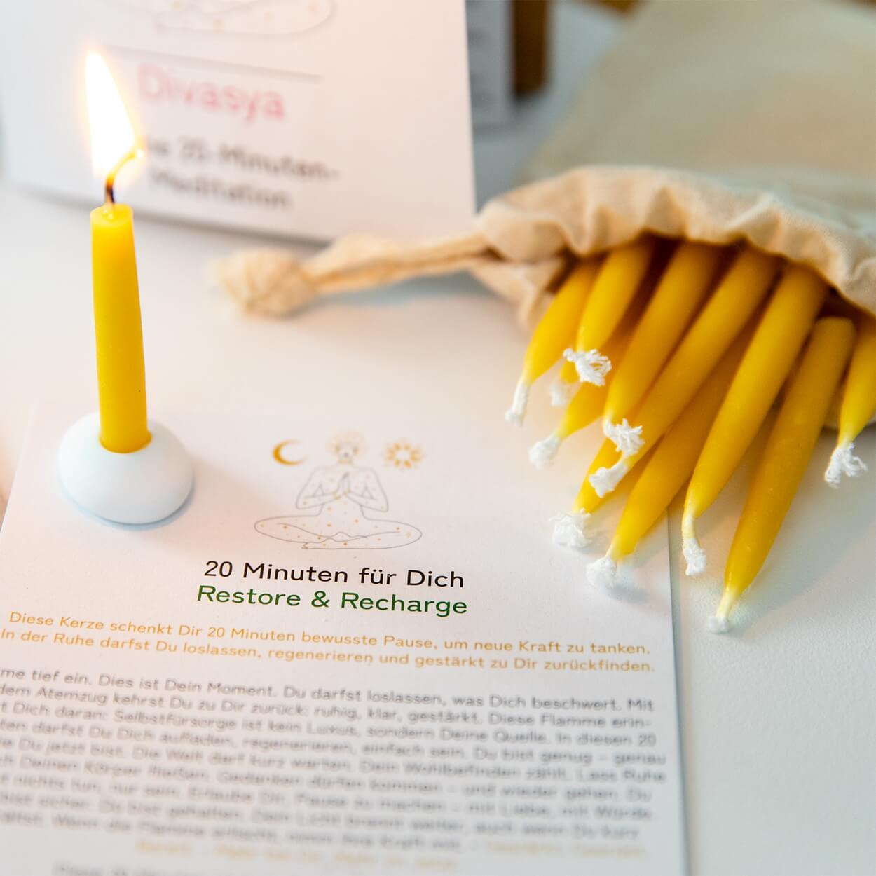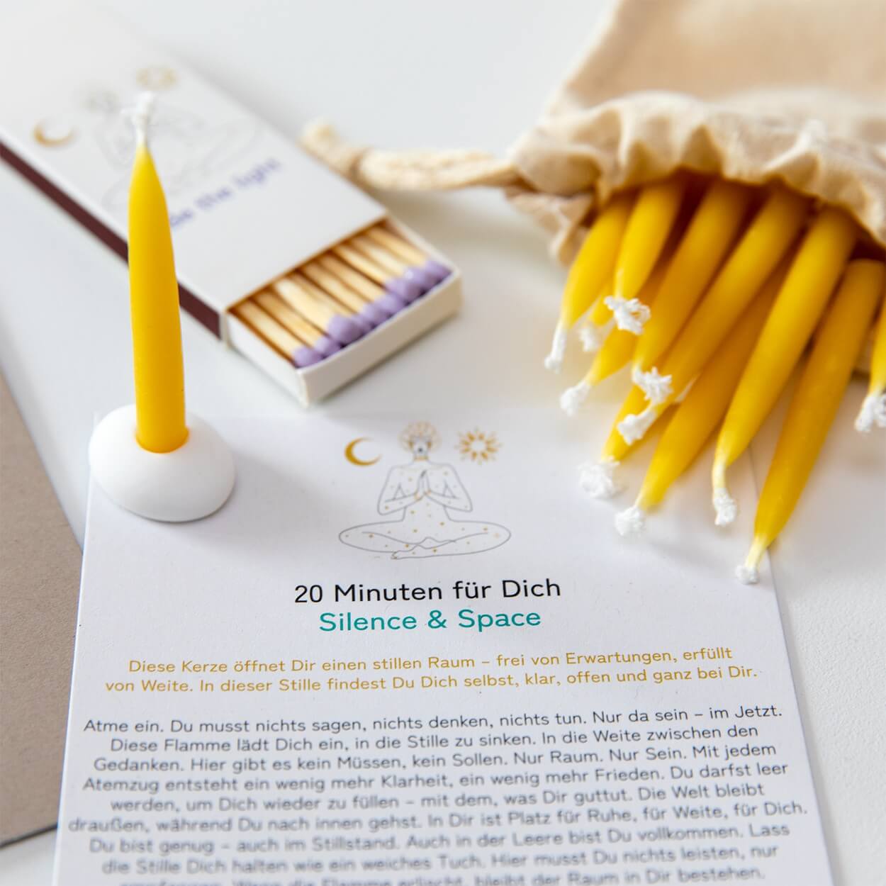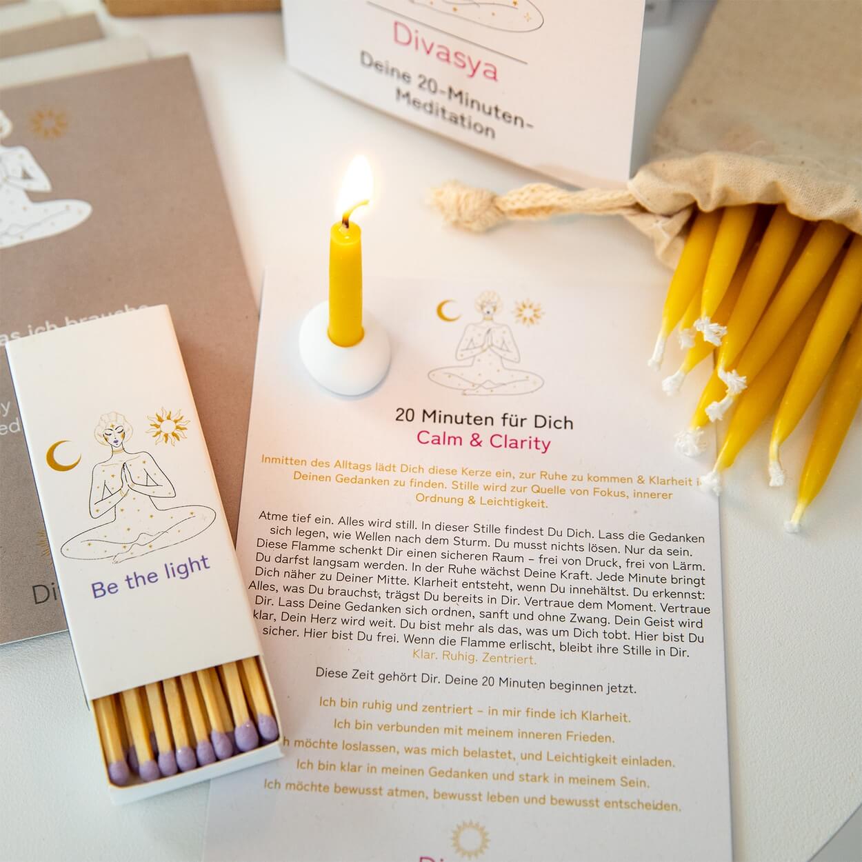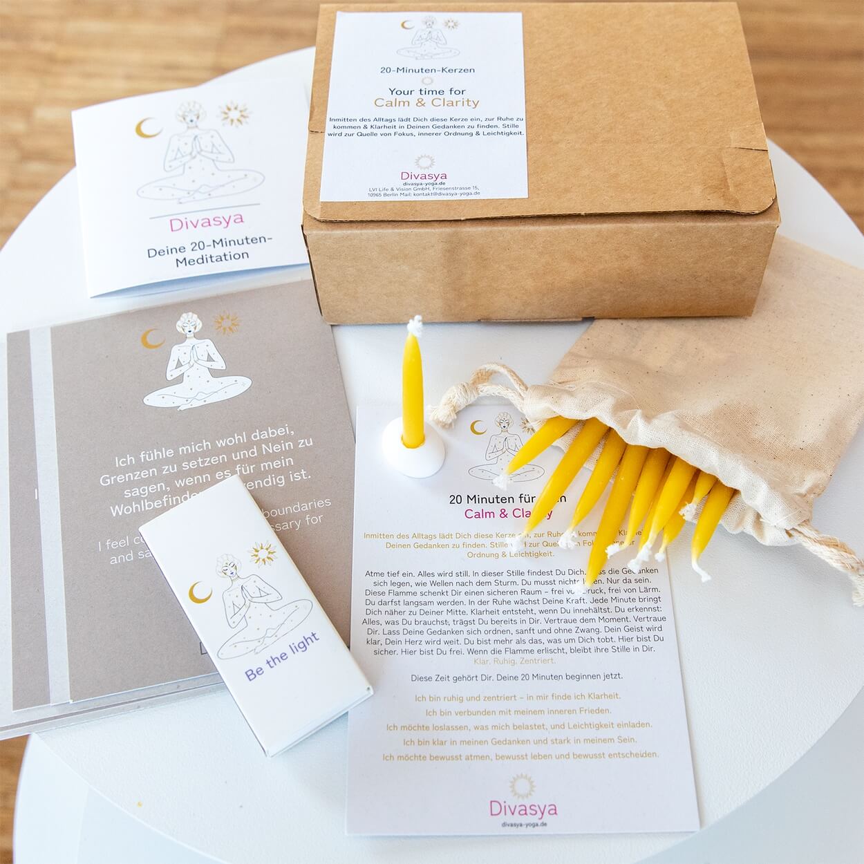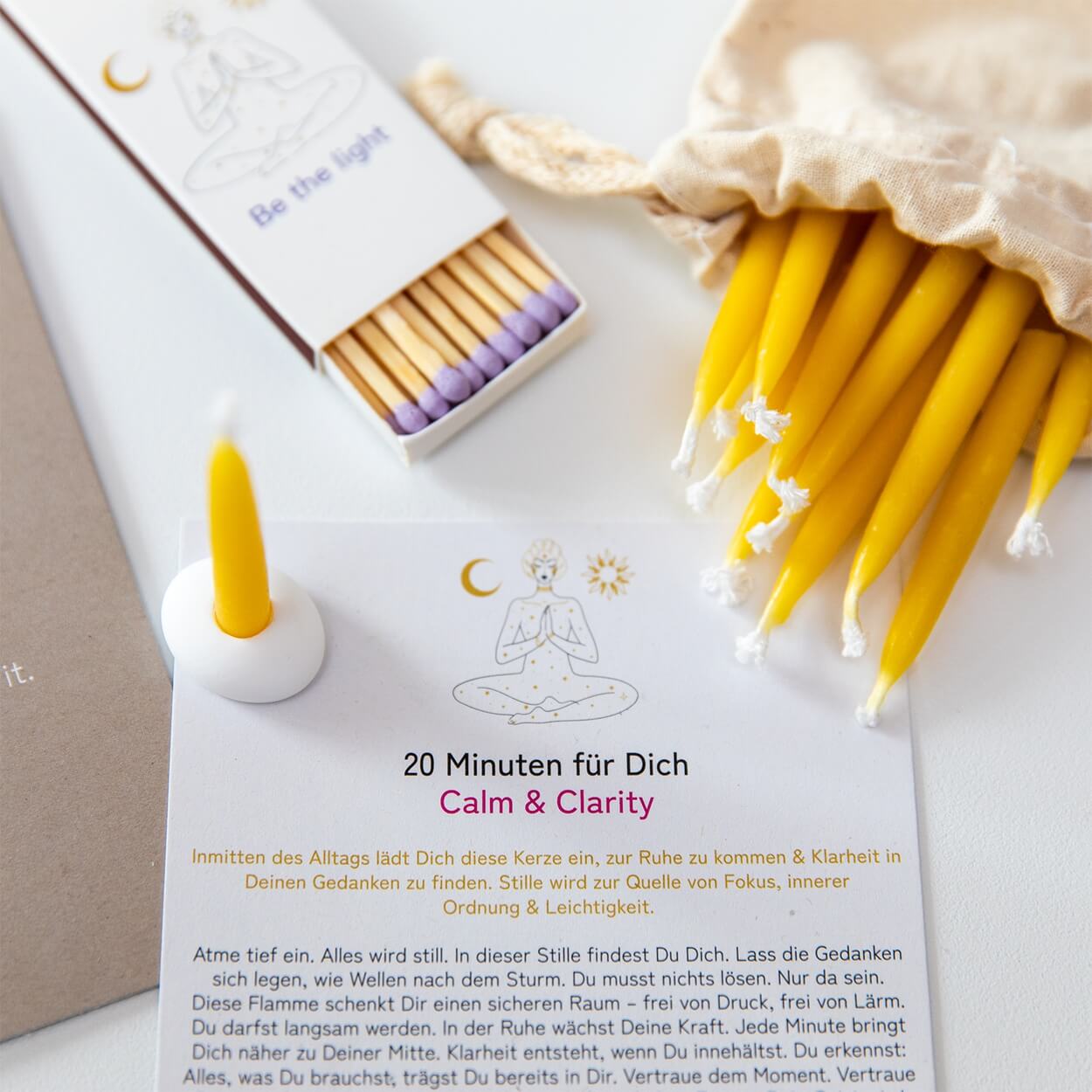 Gönne Dir bewusste Auszeiten im Alltag – ganz ohne Handy, Uhr oder Wecker. Das „20 Minuten für Dich!“ Set ist Dein liebevoll gestaltetes Ritual für innere Ruhe, Fokus und Selbstfürsorge. Jede Bienenwachskerze brennt 20 Minuten – Deine Einladung, den Moment zu genießen, loszulassen und bei Dir anzukommen.