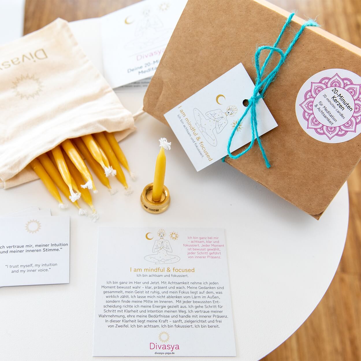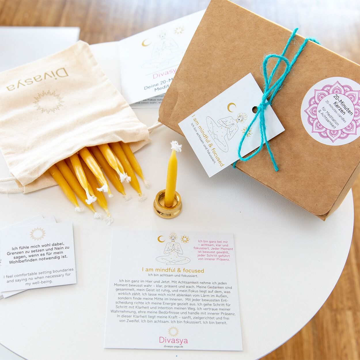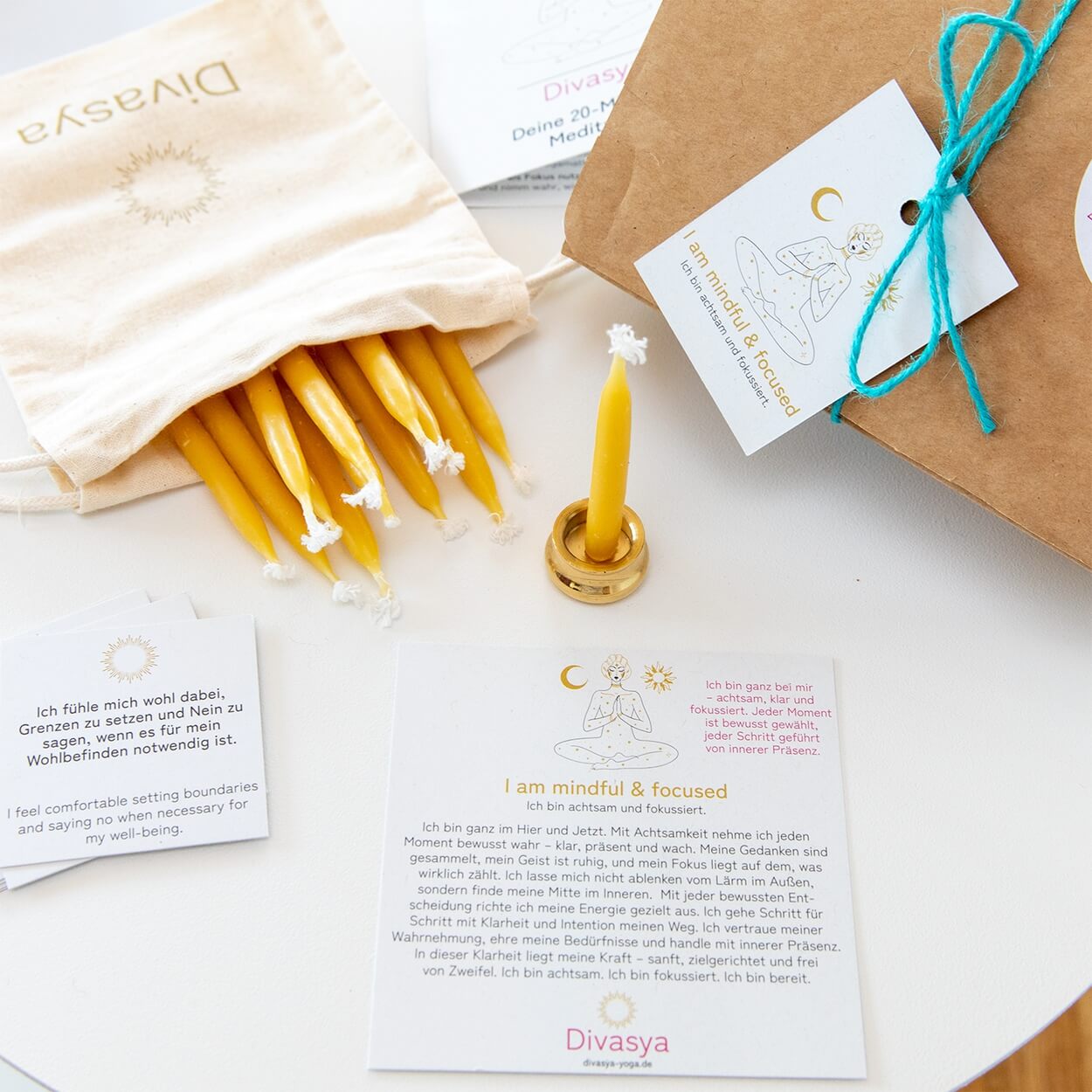 ✔ 12 x 20-Minuten-Kerzen (aus Bienenwachs) im Baumwollsäckchen – ideal für deine tägliche Meditation oder 20 Minuten Auszeit & Achtsamkeit.