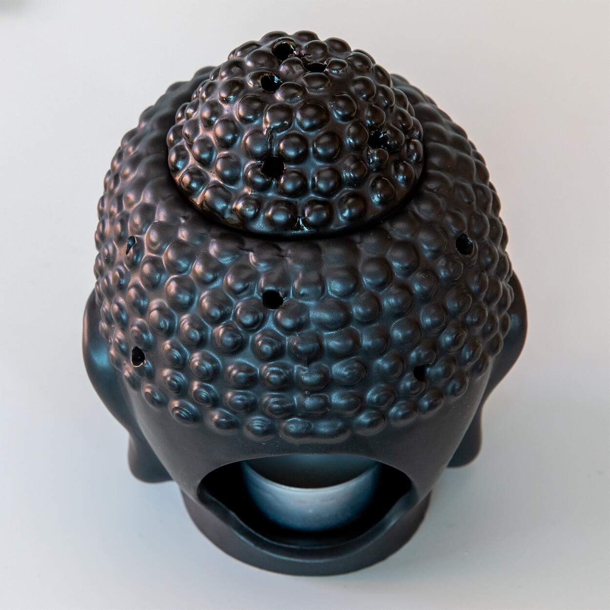 Ein Buddha-Kopf, der als Duftlampe und Räucherschale dient, um eine ruhige und friedliche Umgebung zu schaffen und den meditativen Raum energetisch zu reinigen. -