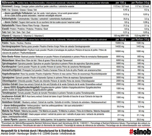 Pektin, Säuerungsmittel Apfelsäure, Gerstengraspulver, Flohsamenschalenpulver, Rote Beete-Saftpulver, Weizenfaser, Spirulinapulver, Ananasfruchtpulver, Karottenpulver, Hagebuttenpulver, Spinatpulver, Chlorellapulver, Aroma, Grünteeextrakt, Tomatenpulver, Heidelbeerextrakt, Acai Beeren Extrakt, Süßungsmittel Steviolglycoside, Acerola Extrakt, Matcha Tee Pulver, schwarzer Pfeffer Extrakt.